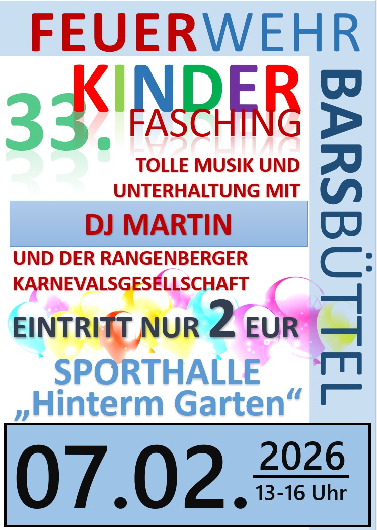 Am Samstag, den 07.02.2026, veranstalten wir wieder das Barsbütteler Faschingsfieber!